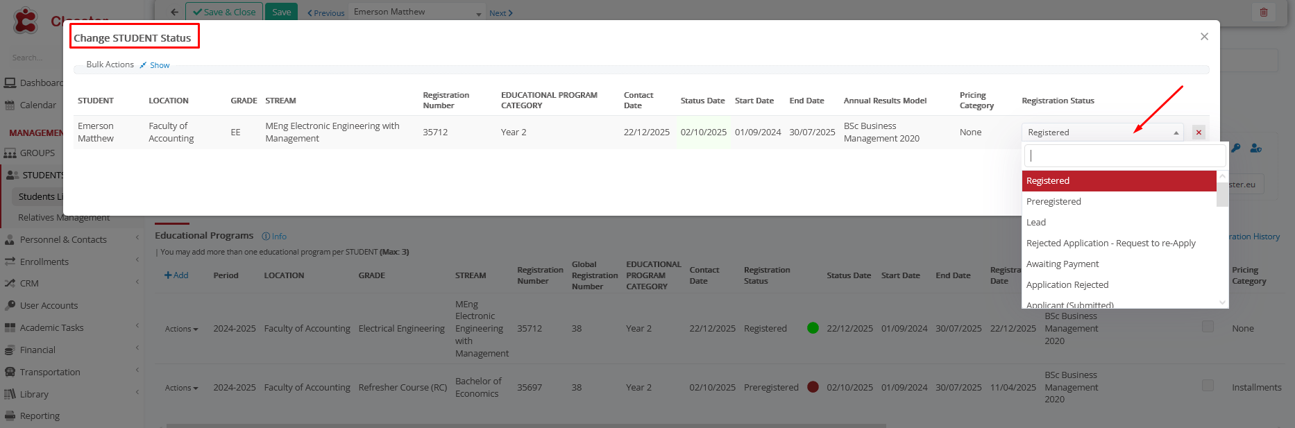 - Type: Select the related entity type. Options include: Students, Relatives, Employees, Suppliers, Groups, Contracts, etc.