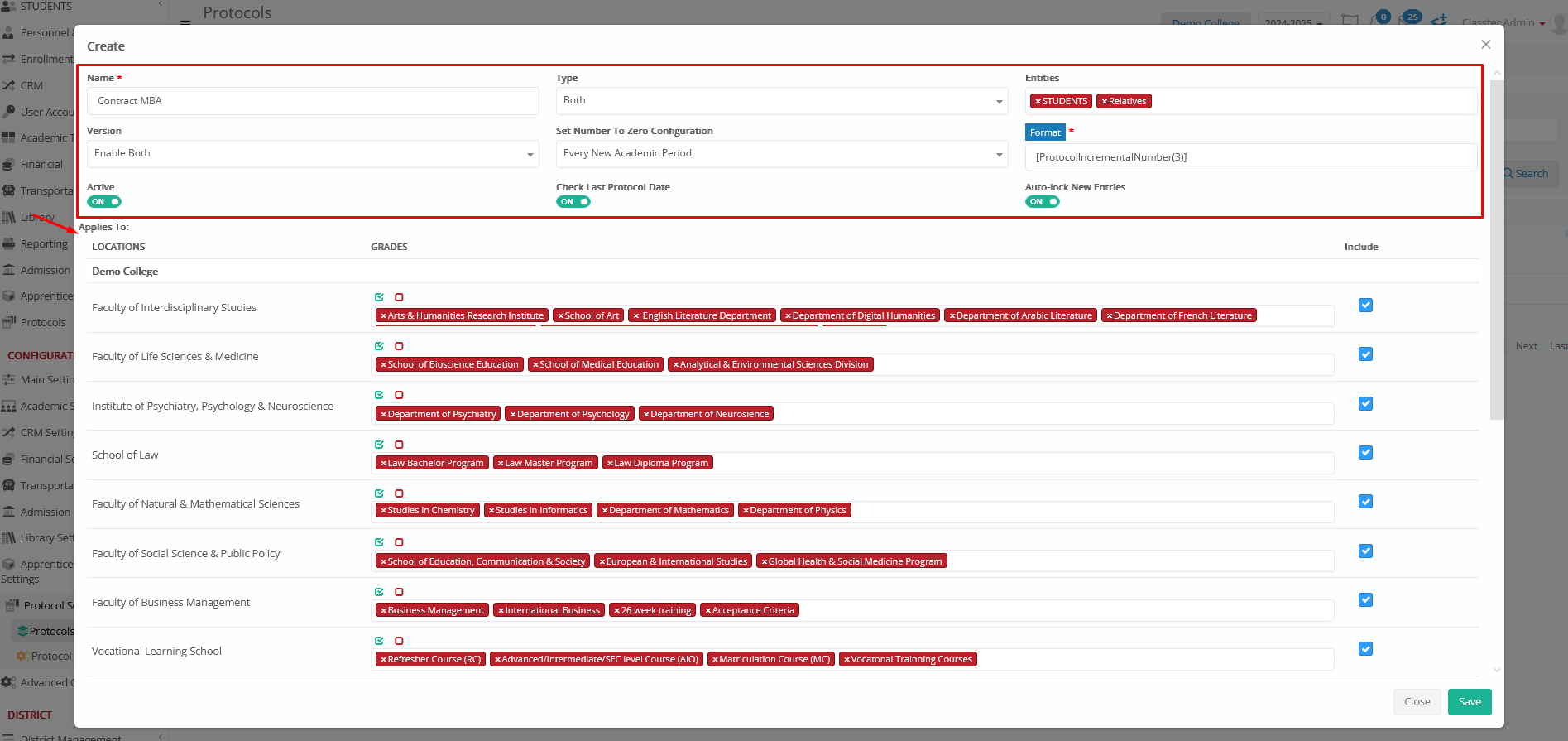 Each protocol defines its own number format and can be set to reset periodically (e.g., annually or monthly). Protocols are linked to specific entities (such as Students, Employees, or Contracts), companies, locations, and grades, and can be designated for incoming, outgoing, or both types of communication.