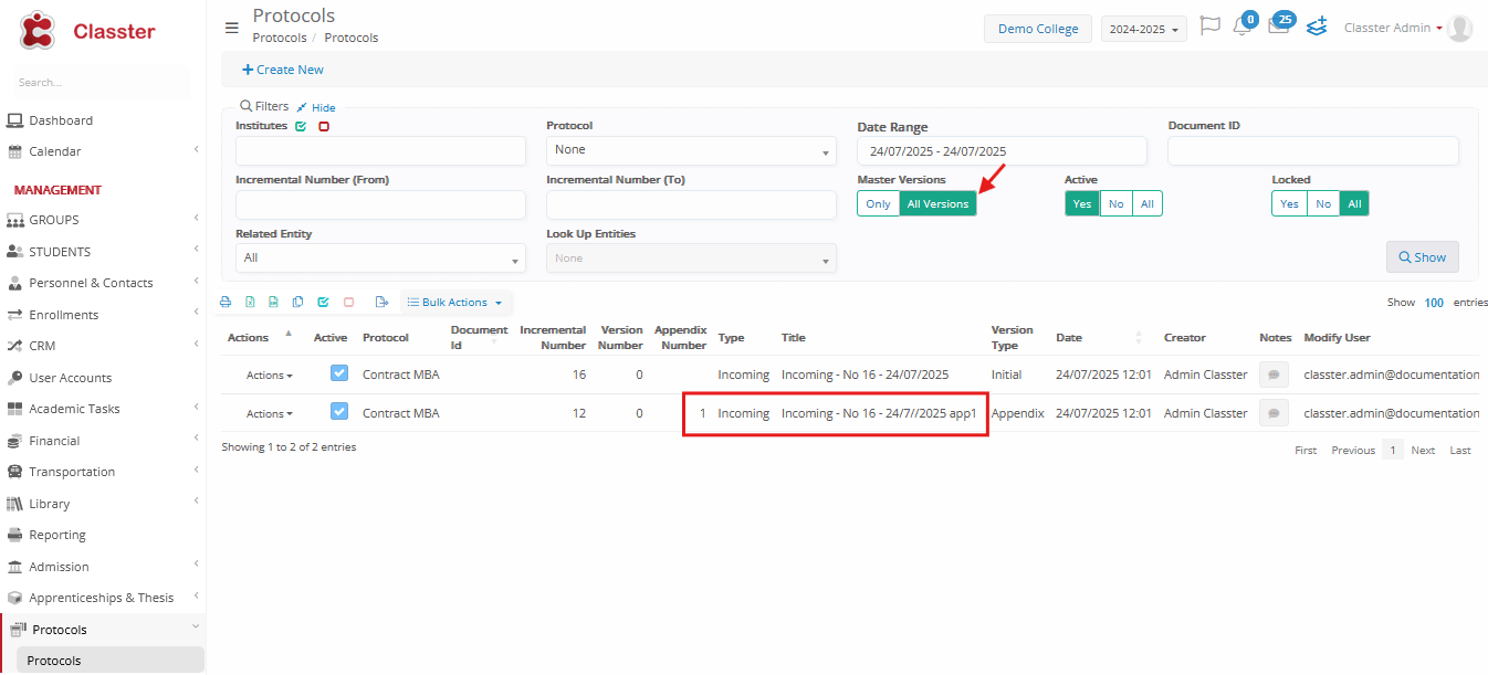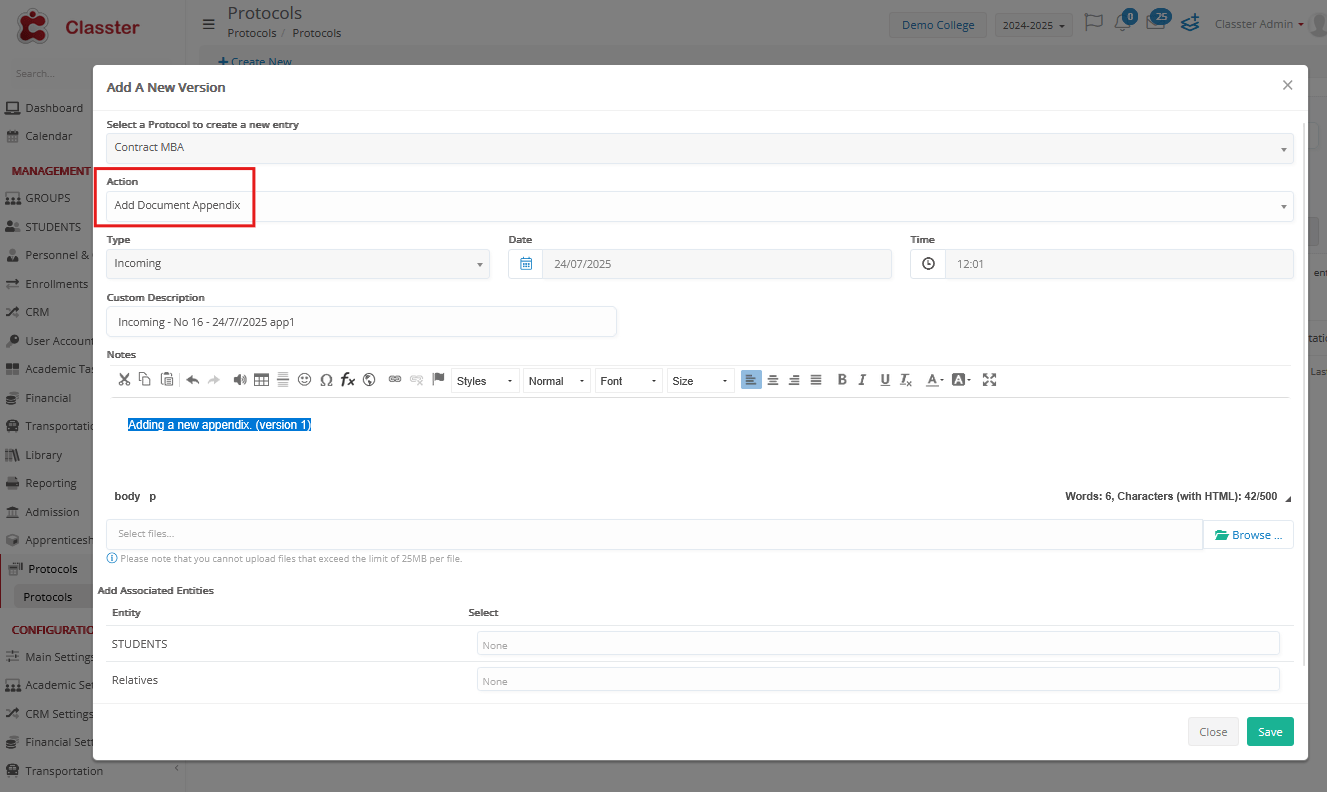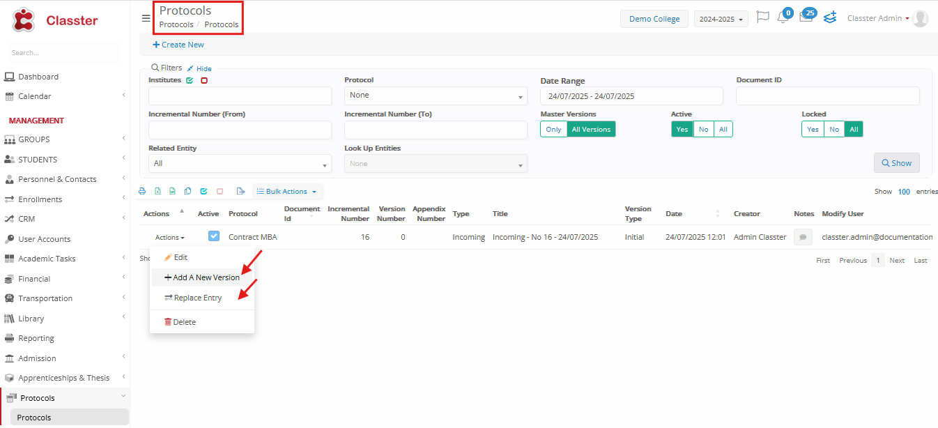 Creating a Protocol Entry in Classter means registering either an official document—such as a contract, letter, or signed agreement—or a communication or administrative action into the institution’s digital logbook. Each entry: