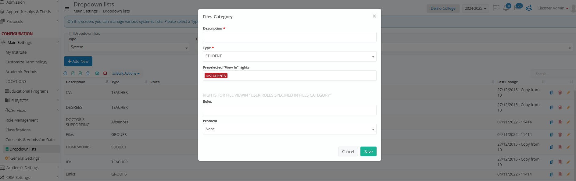- Preselected “View In” Rights: Specify which user roles can view documents in this category. These rights are managed via the “USER ROLES SPECIFIED IN FILES CATEGORY” dropdown.