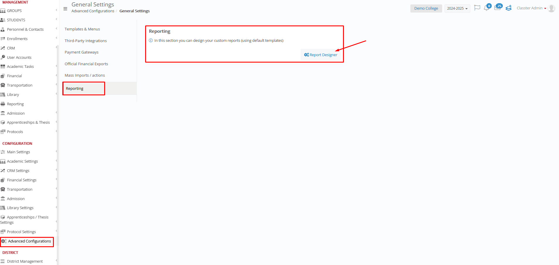 Navigate to: Advanced Configurations > General Settings > Reporting > Report Designer