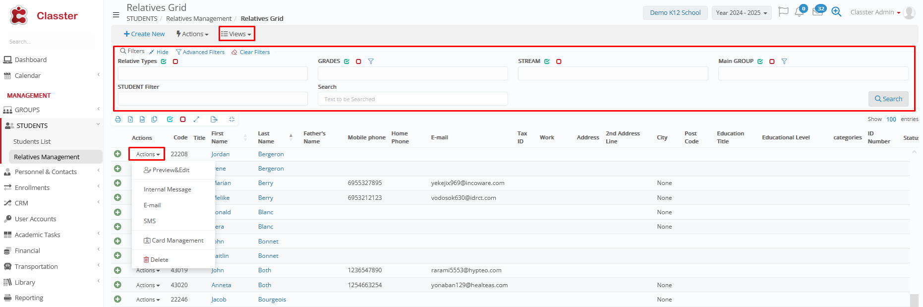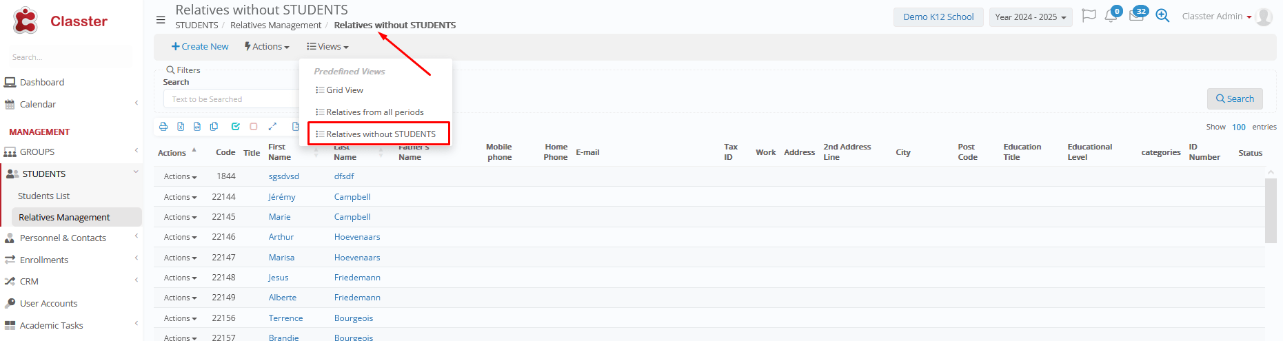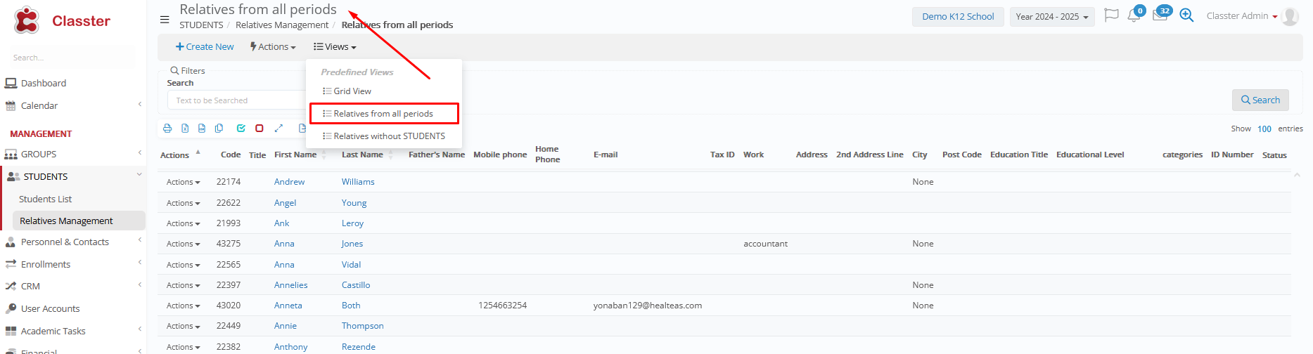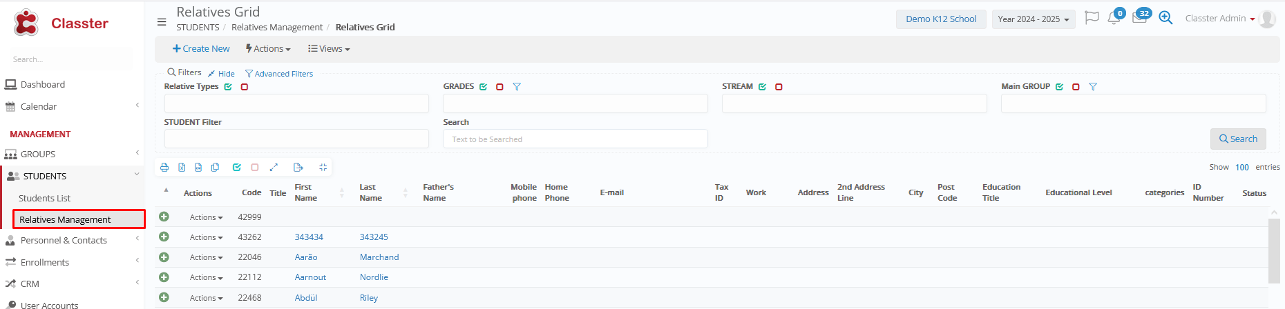 The Relatives Management page allows administrators to view, edit, create, and manage all relative records and their connections to students across all academic periods.