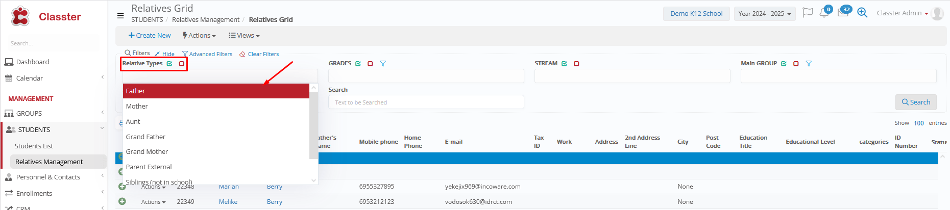 In Classter, Relatives refer to the family members, guardians, or other authorized contacts associated with a student. These individuals play a key role in student communication, consents, billing, and overall engagement with the institution. Examples of relatives include Father, Mother, Grandmother, Grandfather, Aunt, Uncle, Legal Guardian, or any other person who has a defined relationship with the student in the system.