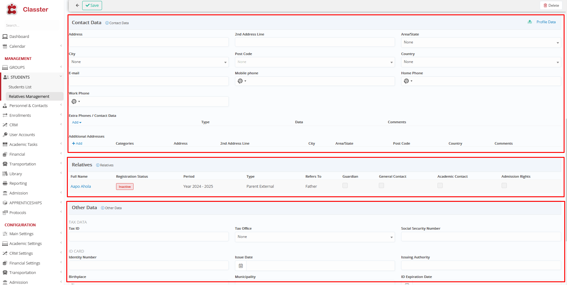 - Click on Save button to Save changes or the Delete button to delete relative.