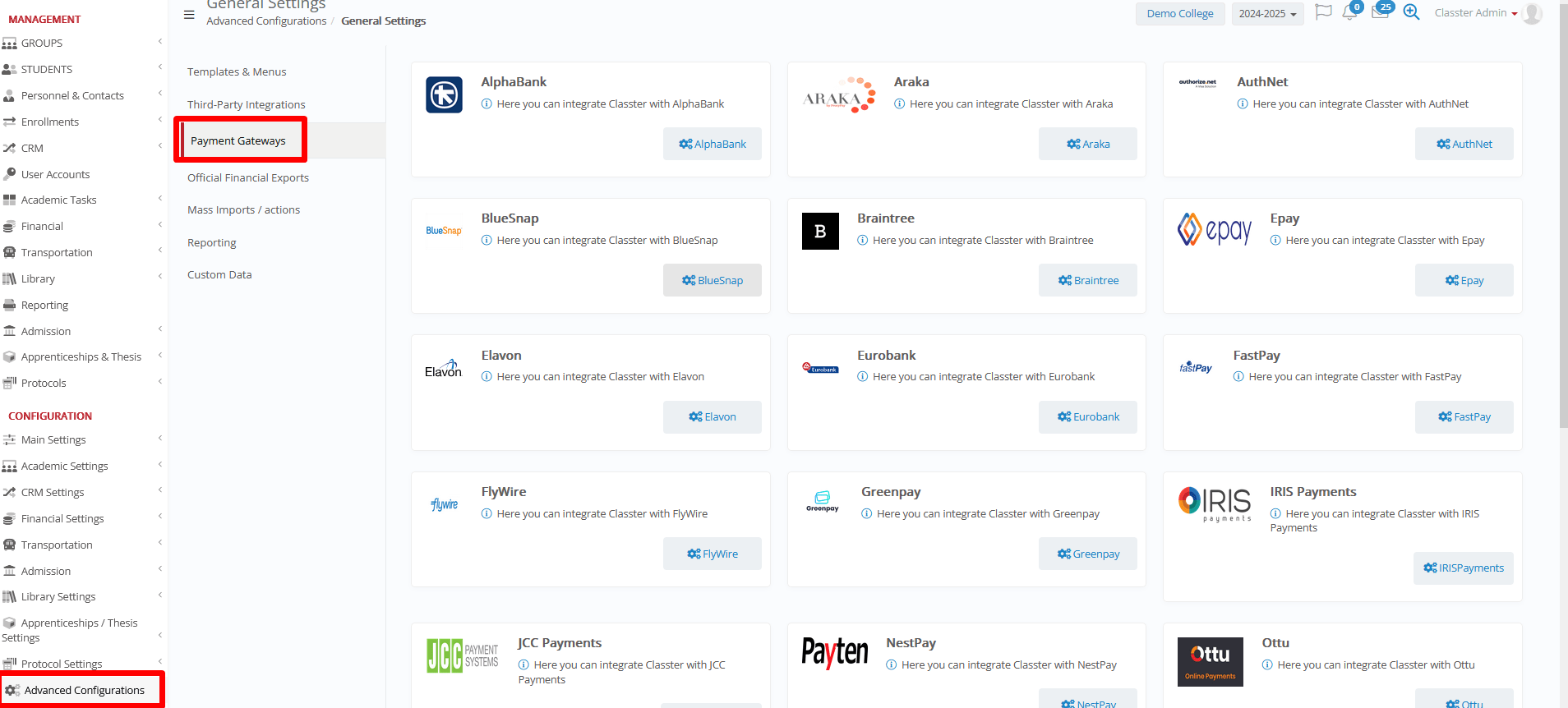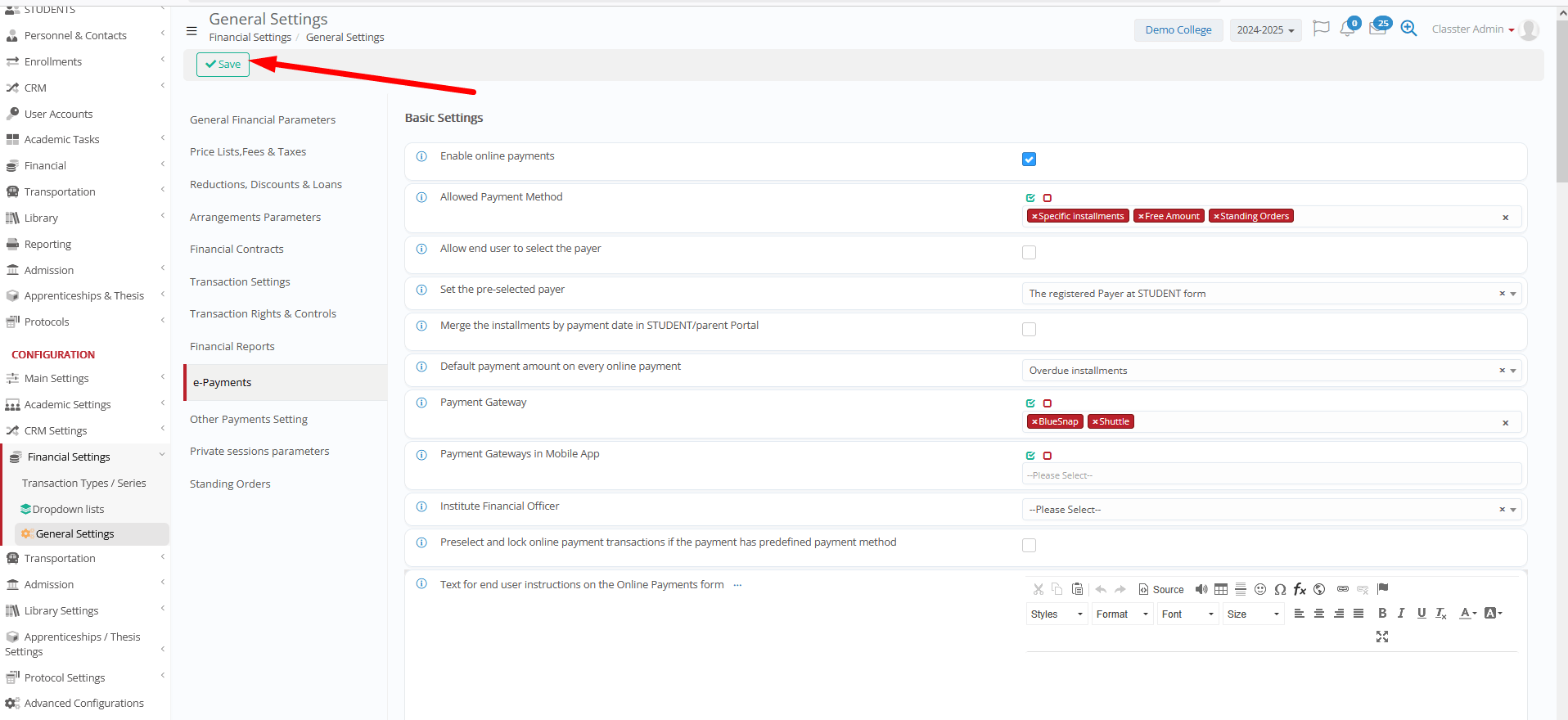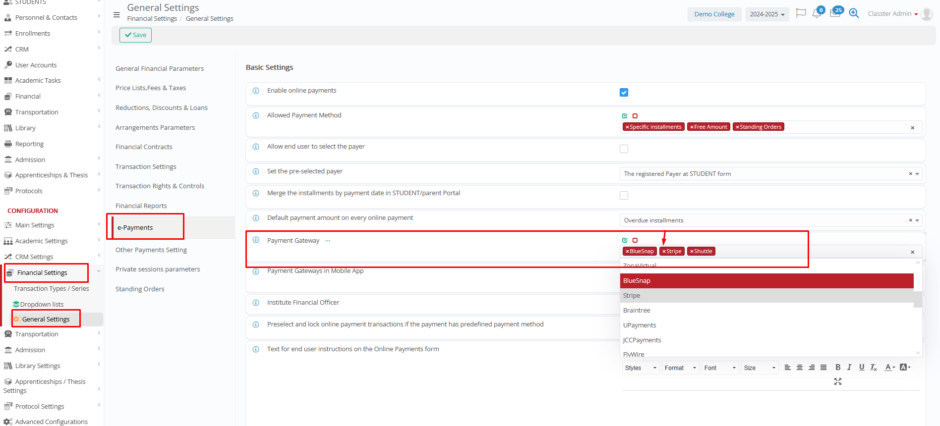 The settings below will disable the option from the end users’ accounts, the Financial menu, and online payments. For this, navigate to Financial Settings > General Settings > E-payments > Basic Settings > setting: Payment Gateway.