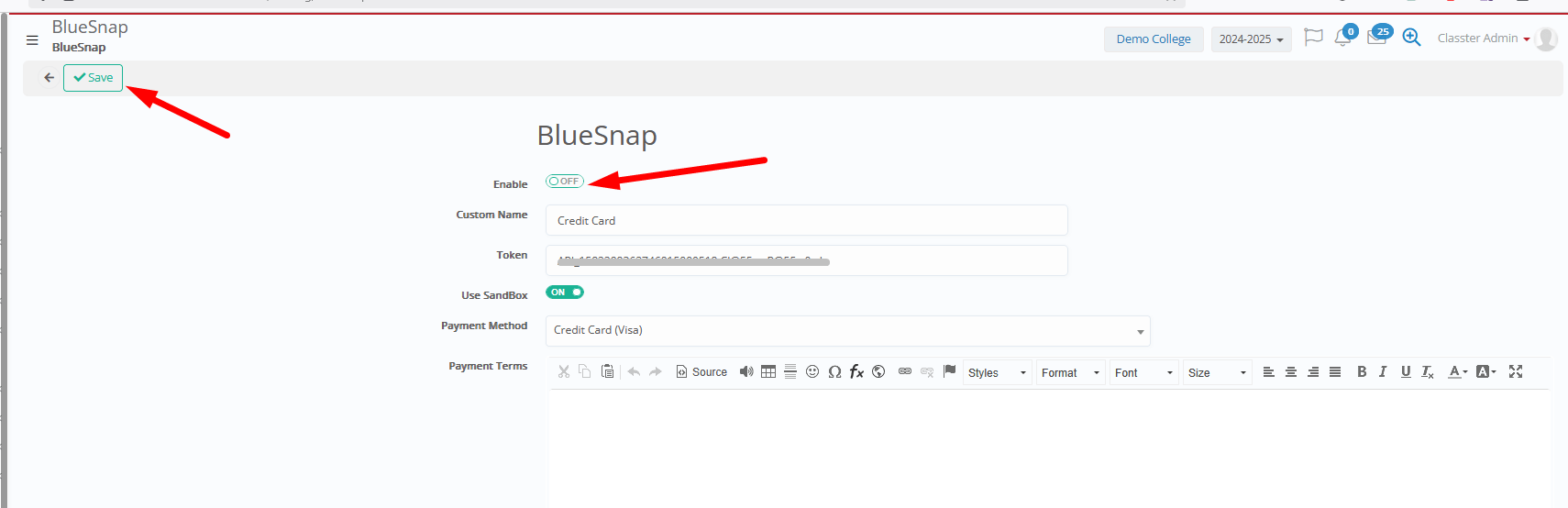 Open the payment gateway integration, switch off the ‘Enable’ option, and click Save.