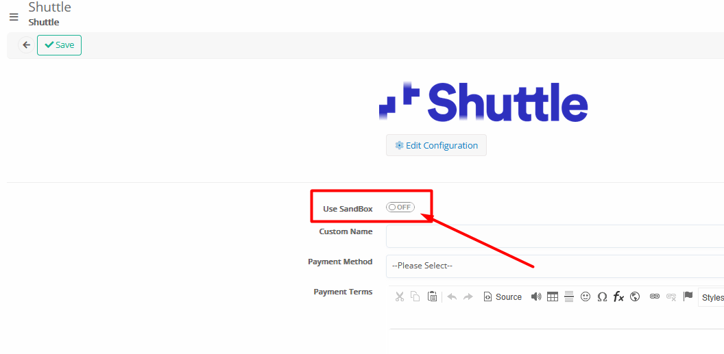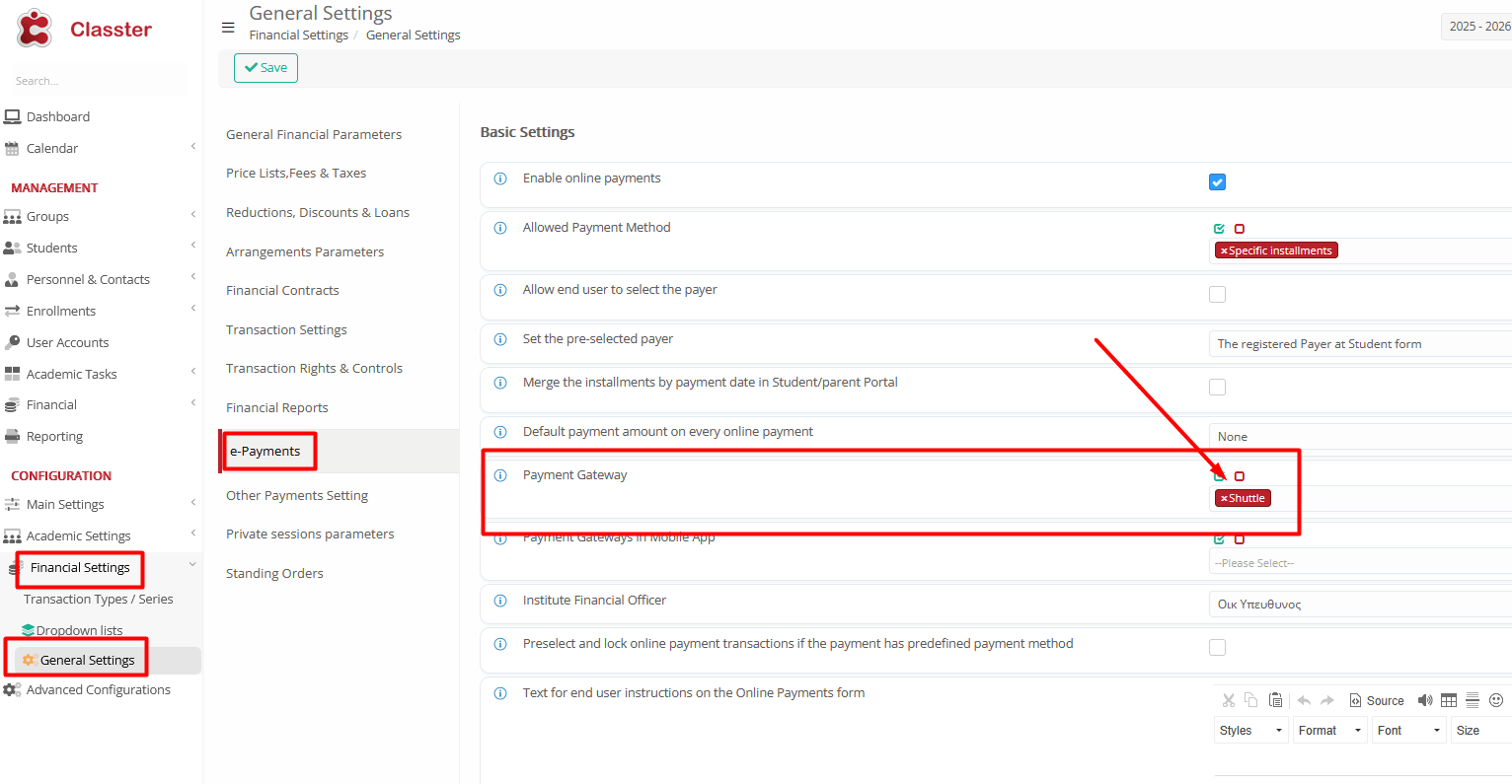 Navigate to Financial Settings > General Settings > E-Payments. Then, under Payment Gateway setting, select “Shuttle”.
